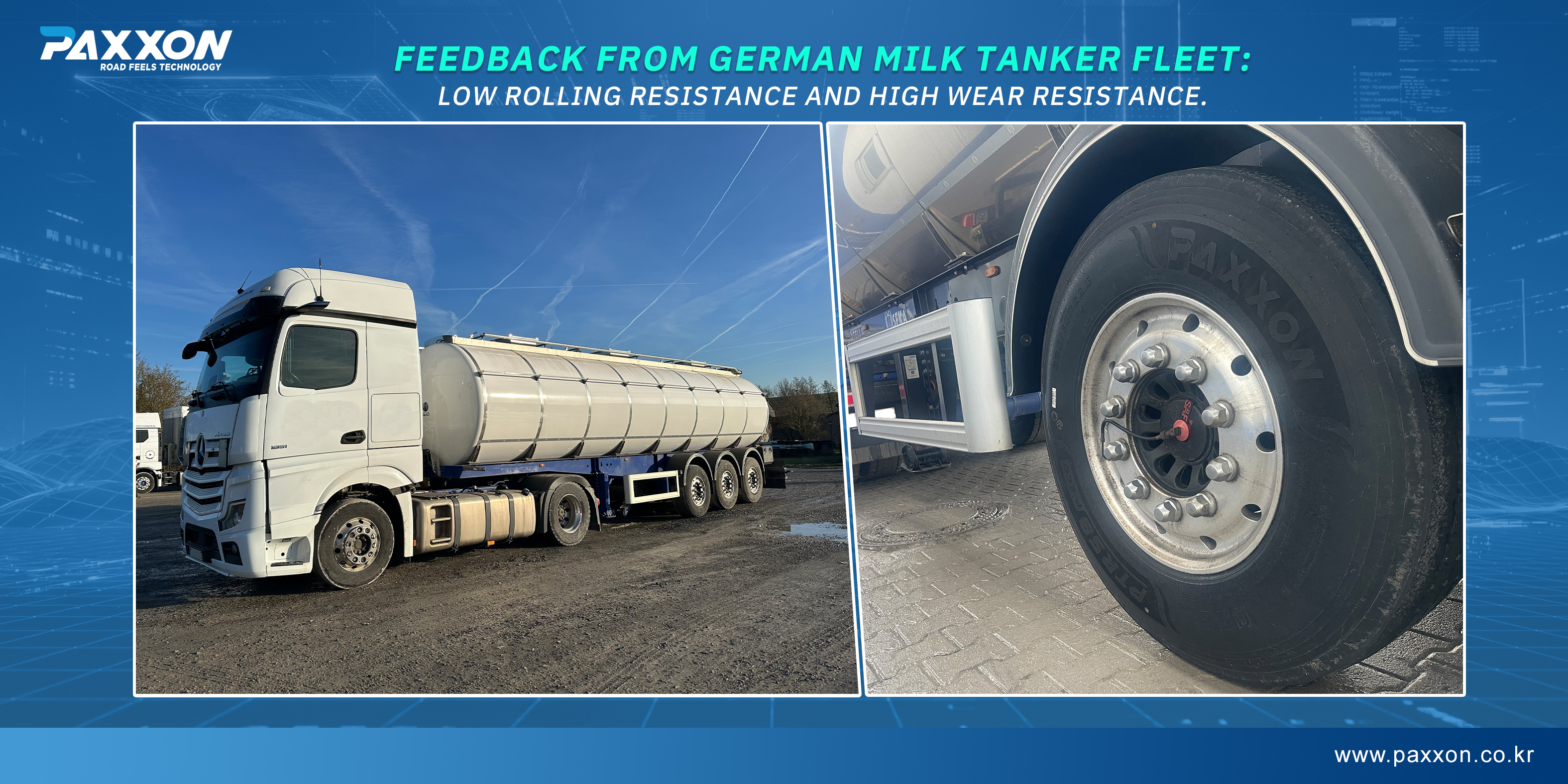 In Germany, we visited a sludge tanker transportation company specialized in the transport of food-grade liquids such as milk and fruit juice, and focused on collecting its feedback on the actual use of PAXXON 385/65R22.5 164K PTR58 tires.
