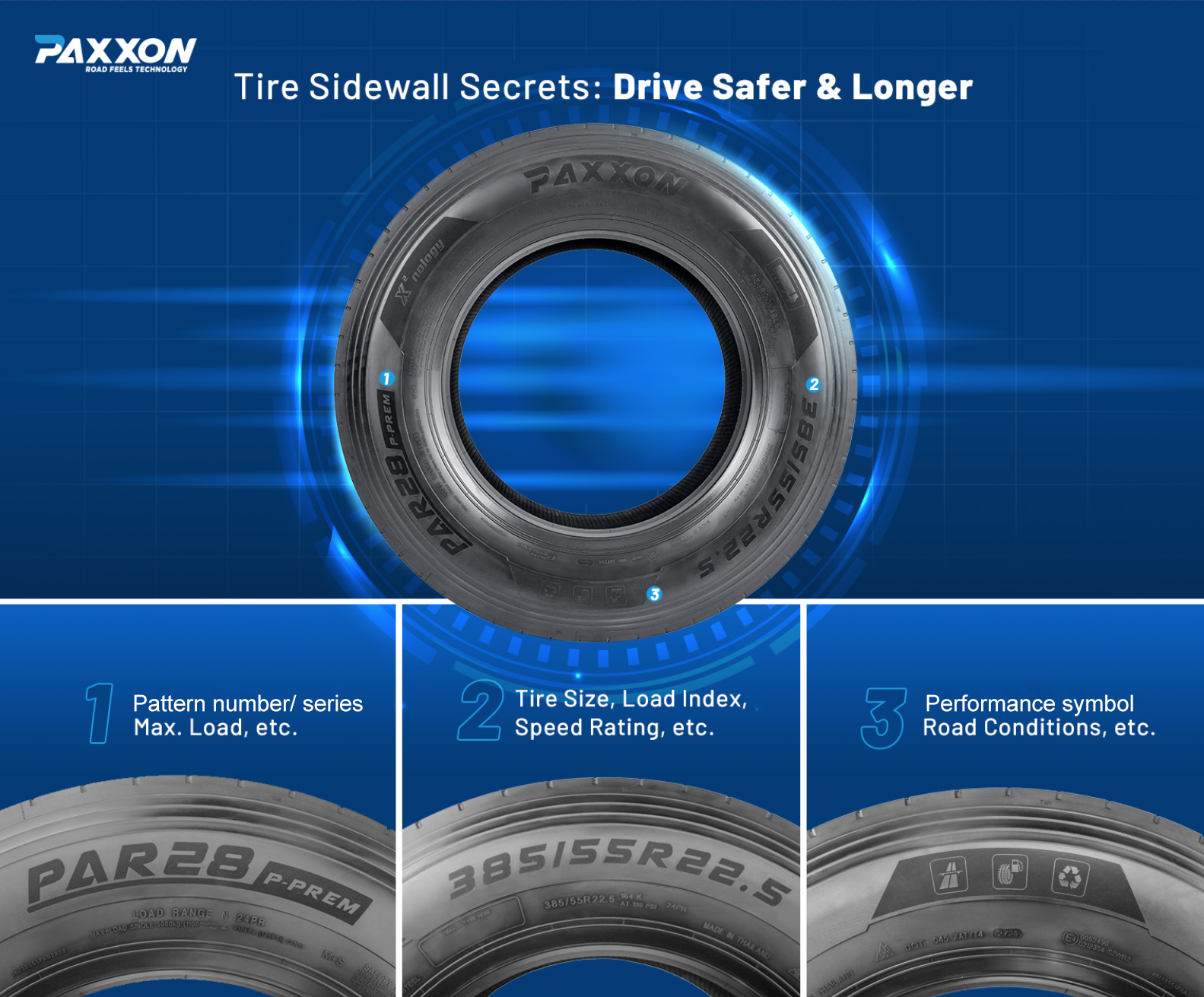 PAXXON 385/55R22.5: Identifies the tire's model and dimensions.