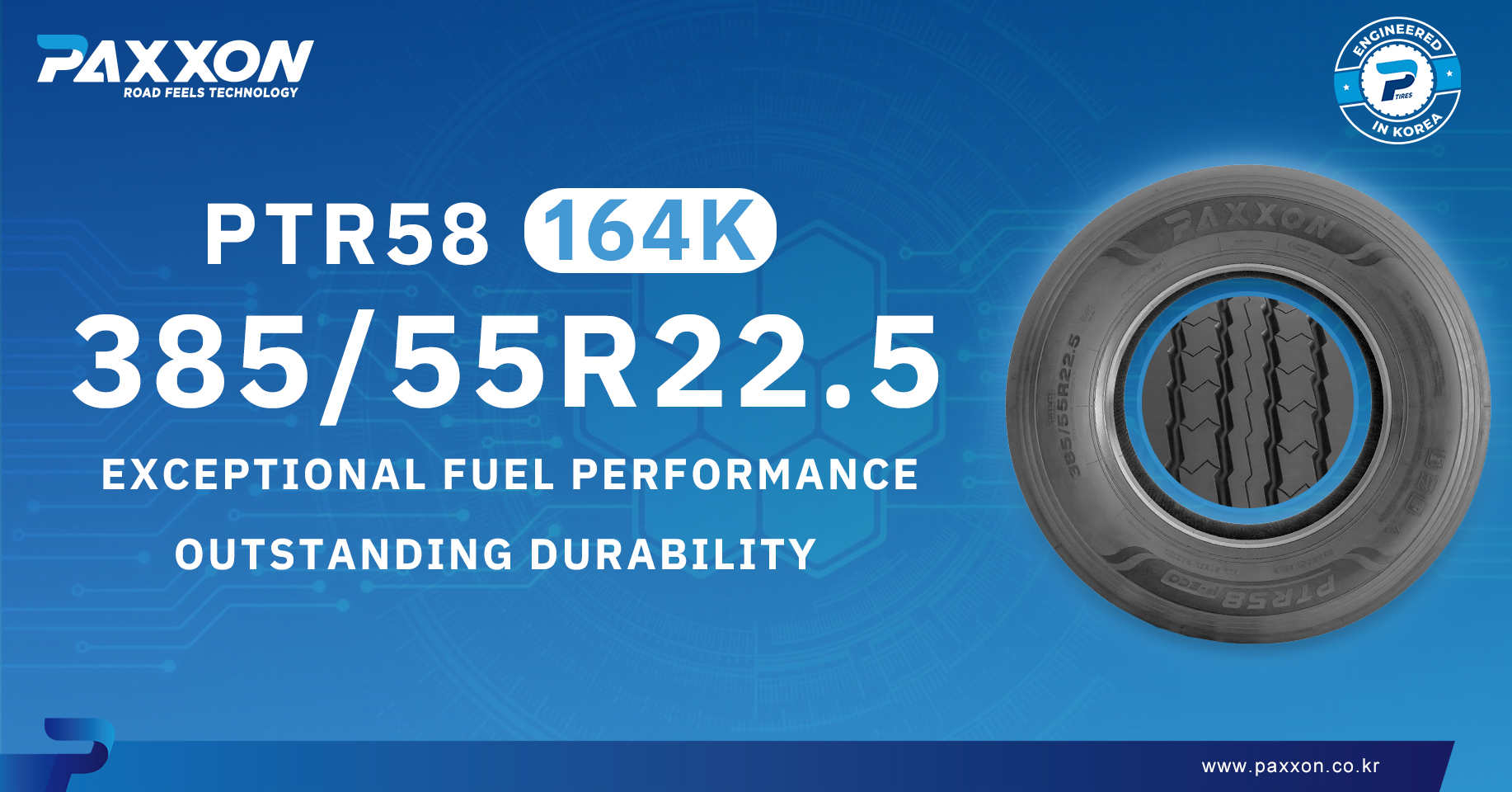 Choose the PAXXON PTR58 385/55R22.5 tire and experience unparalleled handling and wear resistance, making your driving truly exceptional!