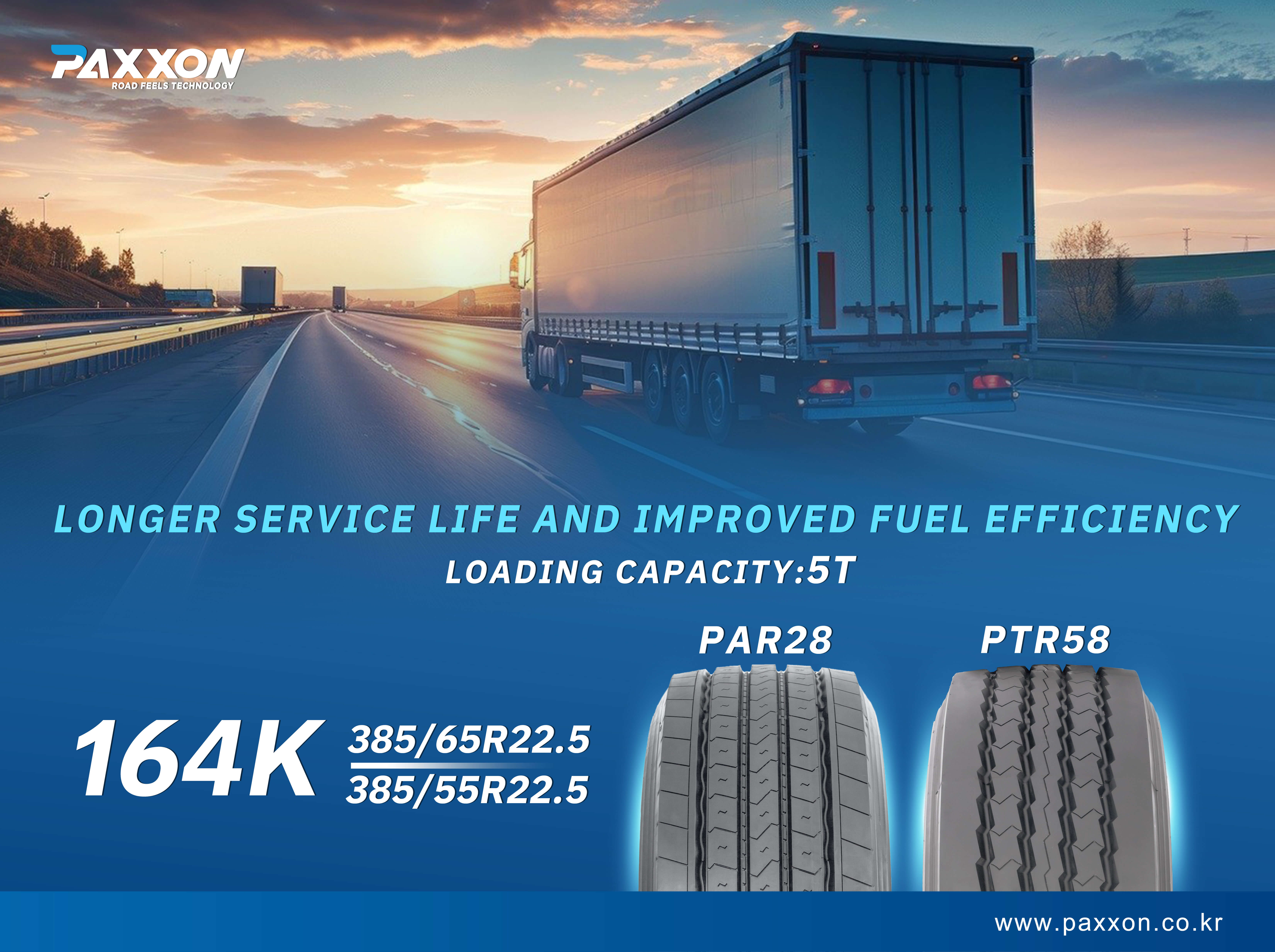 PAXXON 164K series tires have a super load-bearing capacity of 5 tons per tire, which can meet the needs of high-load transportation. Whether it is long-distance driving on highways or regional transportation, it can provide reliable support and safety guarantee.