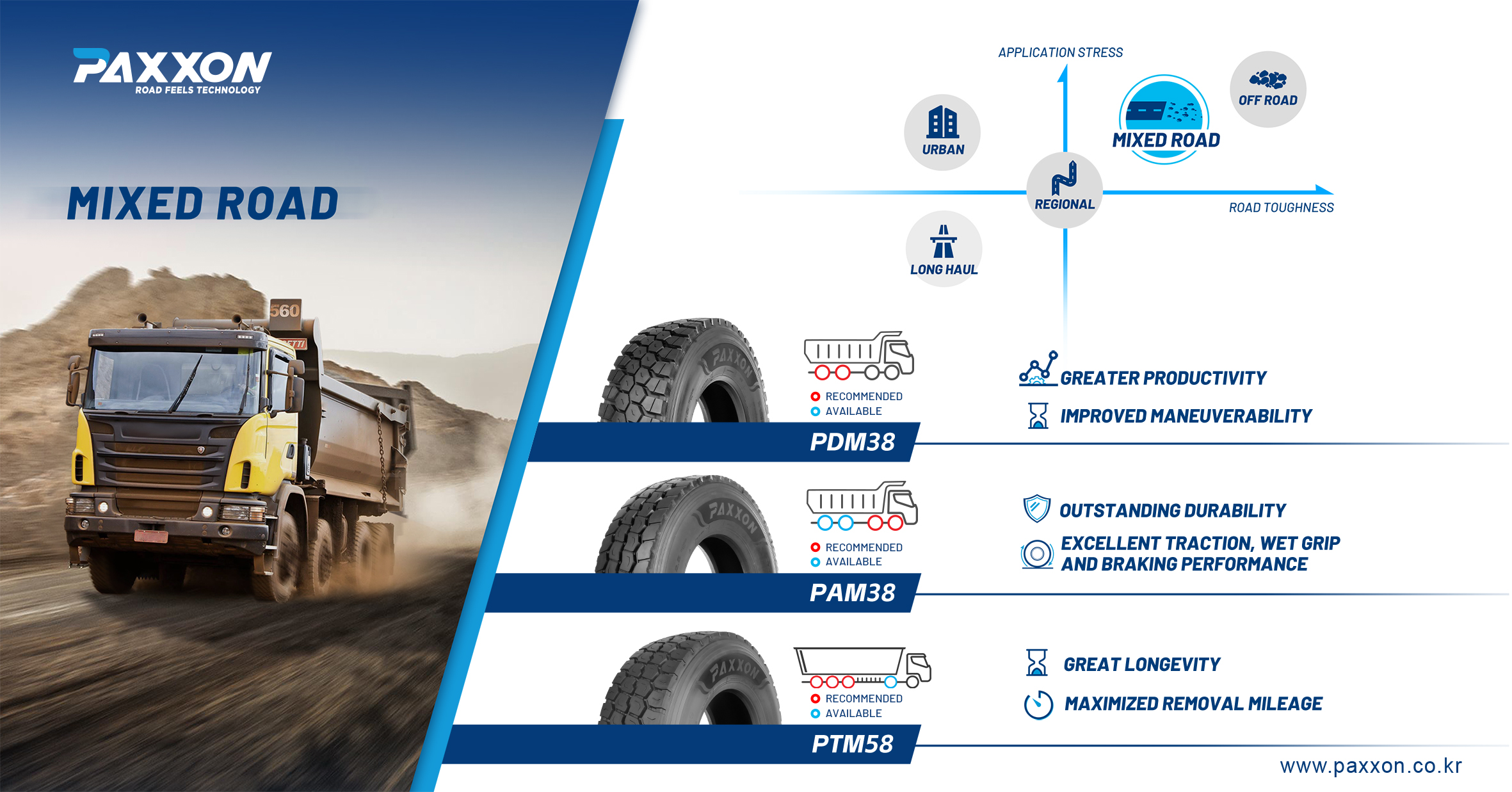 In response to the common mixed road conditions in Europe (such as unpaved roads, construction conditions, and the intersection of urban roads and rural areas), PAXXON has launched the PAM38, PDM38 and PTM58 series of tires specially developed for such complex terrains. These three products have the following features:
